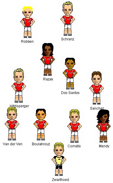 Stammelf: Zwarthoed(19) - van der Ven(31), Cornelis(28), Boulahrouz(31), Mendy(31) - Hitzlsperger(21), dos Santos(25), Razak(31), Sanchez(18) - Robben(31), Schranz(24)